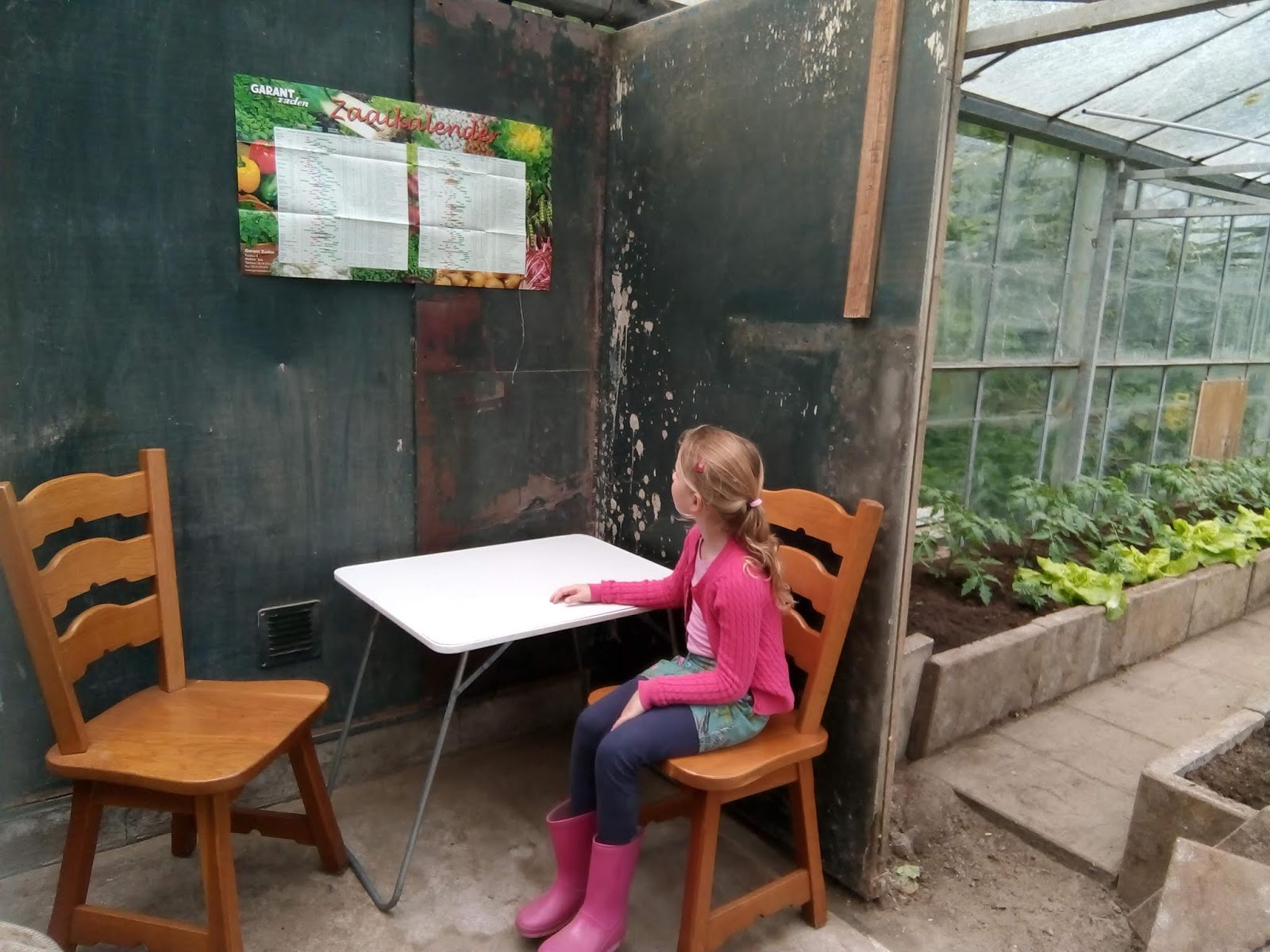 Samen met Nienke maakte ik het 'voorportaaltje' in de kas schoon. Nou ja, schoon, het is al een heel stuk schoner dan het was zullen we maar zeggen. Een tafeltje en paar oude stoelen erbij en een zaaikalender aan de wand, dan is het gelijk een heel ander gezicht! Natuurlijk moet er nog wel het één en ander gebeuren: een plank met wat bekers en een petroleumstelletje zodat we lekker even een bakkie kunnen doen terwijl we aan het werk zijn staat nog op m'n verlanglijstje. Maar dat komt nog wel een keer!